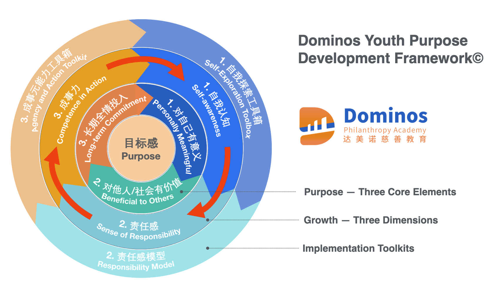 To translate this theory into practice, we developed the Dominos Youth Purpose Framework. Think of it not as a curriculum, but as an “operating system” for growth. This system runs on three practice dimensions, each explicitly designed to cultivate one of the core components of purpose: